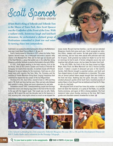 music inside. We each had two families—our kin and our extended Bluegrass family that grew each year. Scott assigned our roles: line sitters, sleepers and runners. He took great pride in running each morning, and our tarps were placed with precision each day for 20 years. Scott groomed my buddy Erin Hyder to run for him on mornings he had to work. A former collegiate soccer star and longtime high altitude runner, she has taken the baton from Scott. In the mid 2000s, the Front of the Line Gang turned an Edgar Meyer, Béla Fleck and Mike Marshall set into a festive Sunday brunch. I baked a couple of pheasant pot pies in the Camel’s Garden, Beth Warren brought a poached salmon, and Scott and Sara dipped dozens of giant strawberries in chocolate. This grew into an annual potluck where people brought their best dishes to the front row tarps. Anything was fair game. One year, I made a smoked pheasant gumbo while Scott had a hundred pounds of oysters flown in from the gulf that we battered and fried for Po’ Boys on-site at a food both. We eulogized Scott at least four times this winter—in a twilight torch ski down the mountain, at a party at The Peaks, in a private family ceremony, and again at Alta’s closing weekend. The final memorial takes place Sunday morning on the tarp. We’ll have gumbo and chocolate-covered strawberries to share.