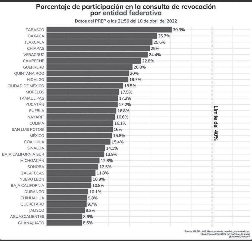Además se informó que prácticamente por la madrugada de este lunes todos los Consejos Distritales concluyeron el cómputo de boletas de la Revocación de Mandato se computaron 722 actas y 547 de paquetes que fueron recontados; se tuvieron 21 mil 677 voto para que se le revocara el mandato al Presidente de México, el 6.32 por ciento; para que siga el 91.17 por ciento, y se tuvieron 8 mil 603 votos nulos, el 2.5 por ciento.