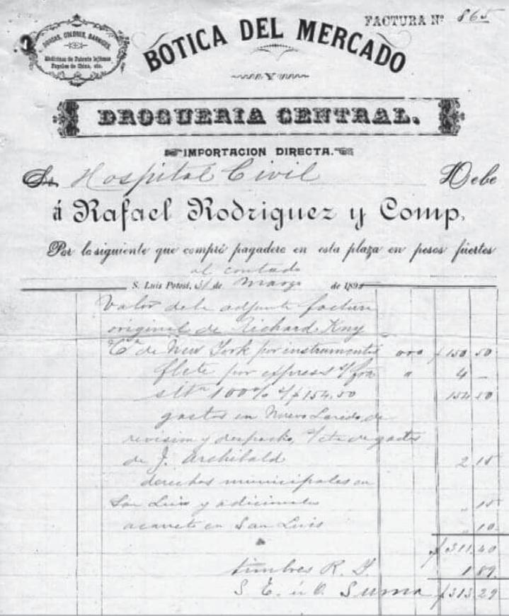 La Botica del Mercado surtía medicamentos al Hospital Civil de la capital potosina Esta Botica abrió sus puertas entre los años de 1865 a 1870.