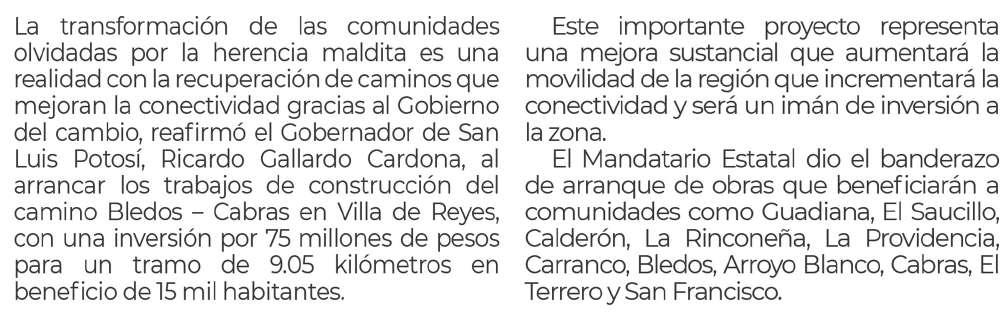 Guzmar Ángel González señaló que además del tramo de la Carretera 57 en el municipio de Matehuala, una de las prioridades será el cruce de CárdenasRayón, ya que se tiene conocimiento de que hay actividad constitutiva de delito por lo que será de las primeros en contar con la presencia de la División de Caminos”.
