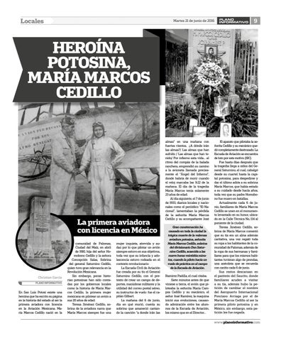 almas” en una mañana con fuertes vientos, ¿A dónde irán las almas?/ Las almas que han sufrido / Las almas que han tenido/ Por infierno esta vida… al ritmo del compás de la balada ranchera, emprendió su camino a la avioneta llamada precisamente el “Ángel del Infierno”, donde habría de morir cuando el reloj marcaba las 9:22 de la mañana. El día de la tragedia María Marcos tenía solamente 23 años de edad. Al día siguiente, el 7 de junio de 1933, diarios locales y nacionales como el periódico “El Nacional”, lamentaban la pérdida de la señorita María Marcos Cedillo y su acompañante José Gran consternación ha causado en toda la ciudad la trágica muerte de la valerosa aviadora potosina, señorita María Marcos Cedillo, sobrina del divisionario Don Saturnino Cedillo, acaecida a las nueve horas veintidós minutos, cuando la piloto hacía un vuelo de práctica en el campo de la Escuela de Aviación. Ramírez Padilla, el cual citaba: Siete minutos antes de que viniese a tierra, el avión que piloteaba la señorita María Campos Cedillo y su mecánico, el señor José Ramírez, la maquina inició sus evoluciones, causando admiración entre los alumnos de la Escuela de Aviación, los mismo que en el Director…