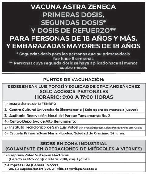 La Brigada Correcaminos encabezada por el instituto Mexicano del Seguro Social (IMSS) da a conocer fechas de vacunación para la zona metropolitana de San Luis y Soledad de la vacuna Astra Zeneca para primeras, segundas y dosis de refuerzo para personas mayores de 18 años y más así como mujeres embarazadas.
