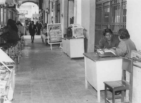 Por su cercanía con la oficina de Correos de México, además de la venta de una infinidad de productos, fueron llegando a La Alhóndiga los escribanos y las tiendas de comida para quienes iban a la Terminal del Ferrocarril.