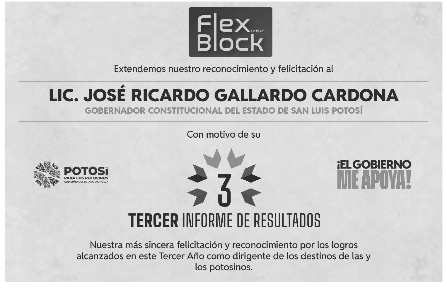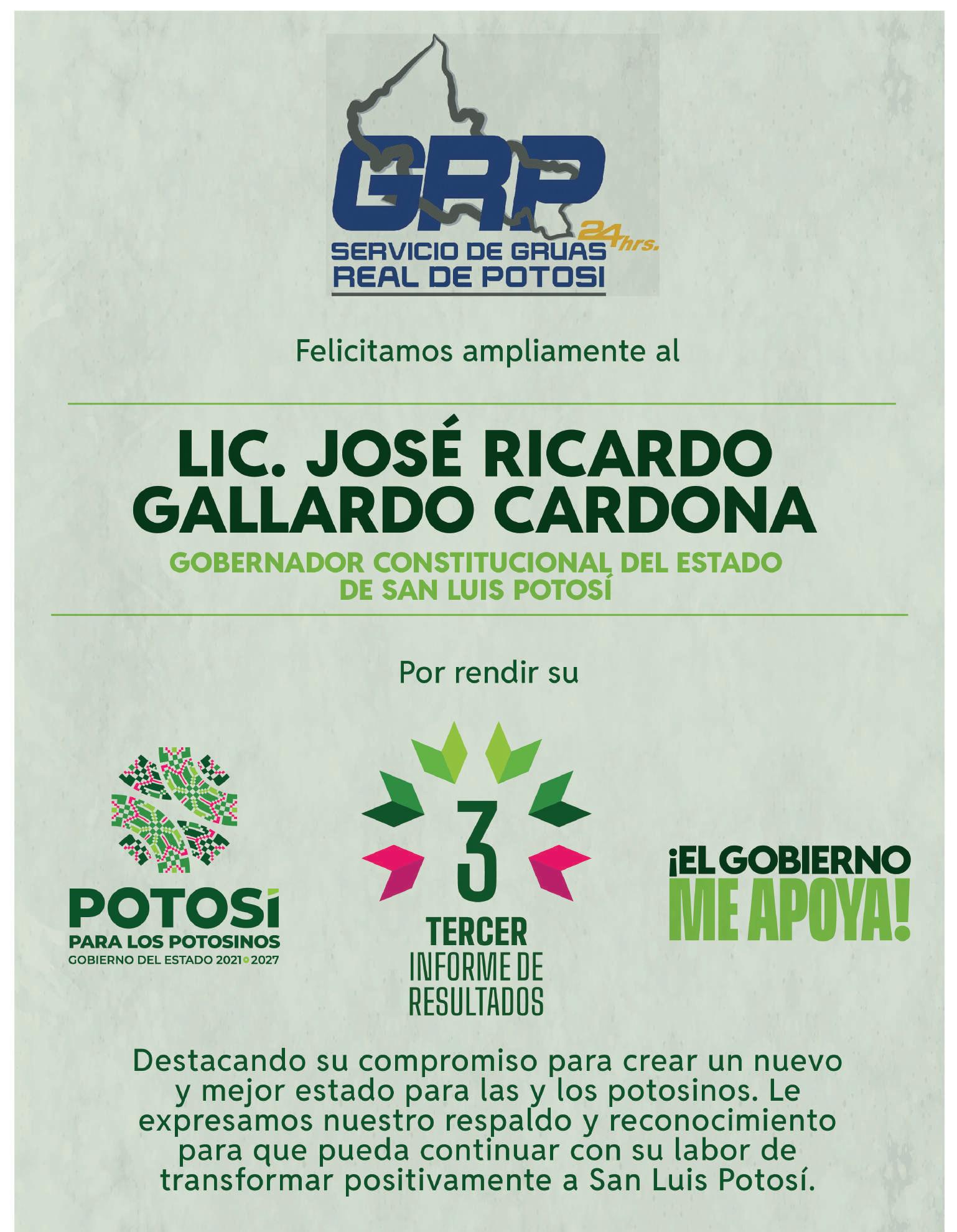 El tercer informe de Ricardo Gallardo Cardona, gobernador de San Luis Potosí, se realizó en el municipio de Matehuala, desde donde convocó a la ciudadanía a mantenerse unida para seguir transformando al Estado, y aseguró que en los tres años que le quedan continuará el crecimiento de San Luis Potosí, gracias a las políticas y acciones implementadas por la actual administración estatal.