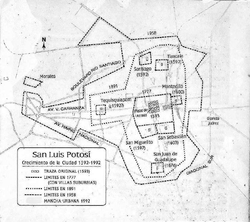 De acuerdo con los planos que se encuentran en el Archivo Histórico del Estado, entre 1592 y 1992, la capital potosina creció muchísimo, aunque después del 92 creció aún más hacia el sur y el oriente debido a la llegada de empresas industriales.