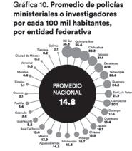 Respecto al promedio de policías ministeriales o investigadores por cada 100 mil habitantes por entidad federativa, México Evalúa situó a San Luis Potosí en el lugar número 8, con 21.9 policías ministeriales o investigadores por cada 100 mil habitantes.