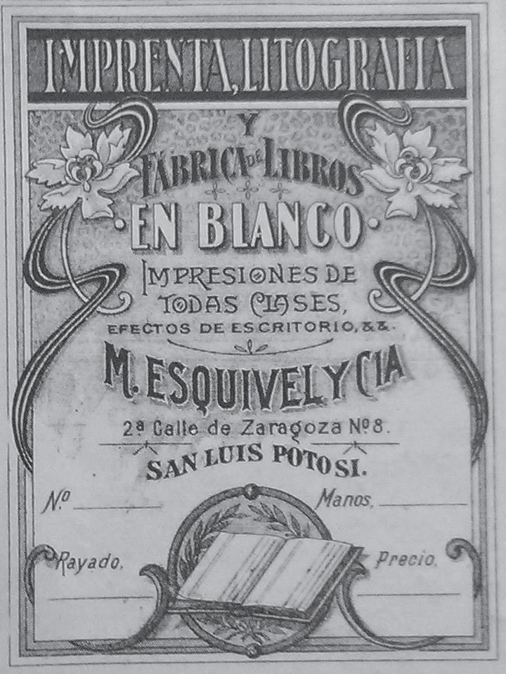 Una de las imprentas más antiguas de San Luis Potosí es la Imprenta Litografía Esquivel, que en 1918 así se anunciaba.