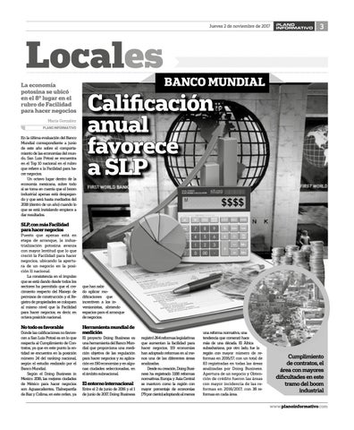 No todo es favorable Donde las calificaciones no favorecen a San Luis Potosí es en lo que respecta al Cumplimiento de Contratos, ya que en este punto la entidad se encuentra en la posición número 24 del ranking nacional, según el estudio realizado por el Banco Mundial. Según el Doing Business in Mexico 2016, las mejores ciudades de México para hacer negocios son Aguascalientes, Tlalnepantla de Baz y Colima, en este orden, ya
