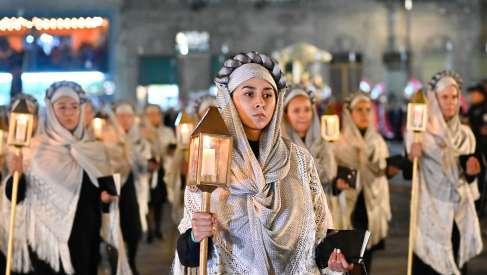 La conmovedora imagen de la Virgen de la Soledad, la única que está bajo palio, y que recorre las calles del Centro Histórico entre cirios encendidos, estuvo precedida por las 30 cofradías que participaron este año y que salieron, en una lúgubre columna, por la puerta principal del Templo del Carmen.