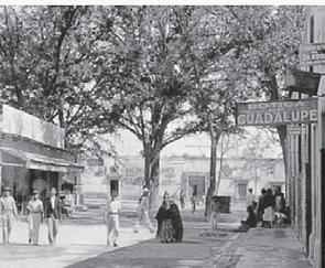 Esta era la entrada de nuestra hermosa Alameda, que se distinguía de las otras esquinas del jardín por el arco que la adornaba. ¿Reconoces la esquina? Sí, es la esquina de lo que hoy conocemos como Avenida Universidad, sin el puente, y el lado Oriente de la Alameda.