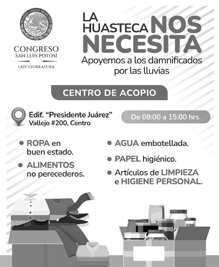 HUASTECA. Las lluvias dejaron daño y dolor, pero también solidaridad. El Congreso abrió centros de acopio y el Gobierno estatal lleva apoyos. En medio del lodo y la pérdida, San Luis demuestra que cuando la naturaleza pone a prueba, la unidad se vuelve nuestra fuerza más poderosa.