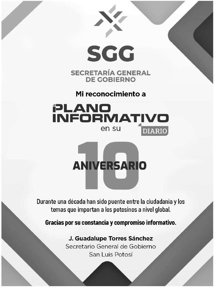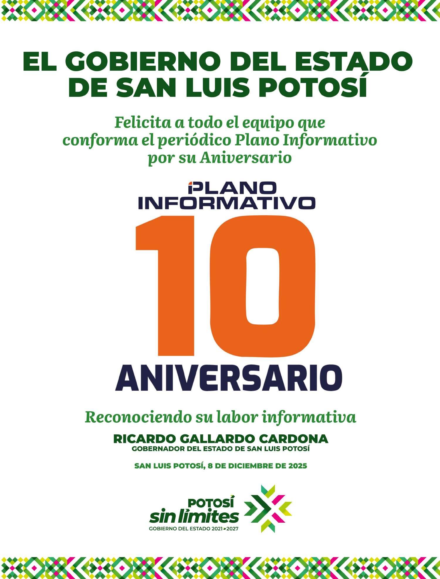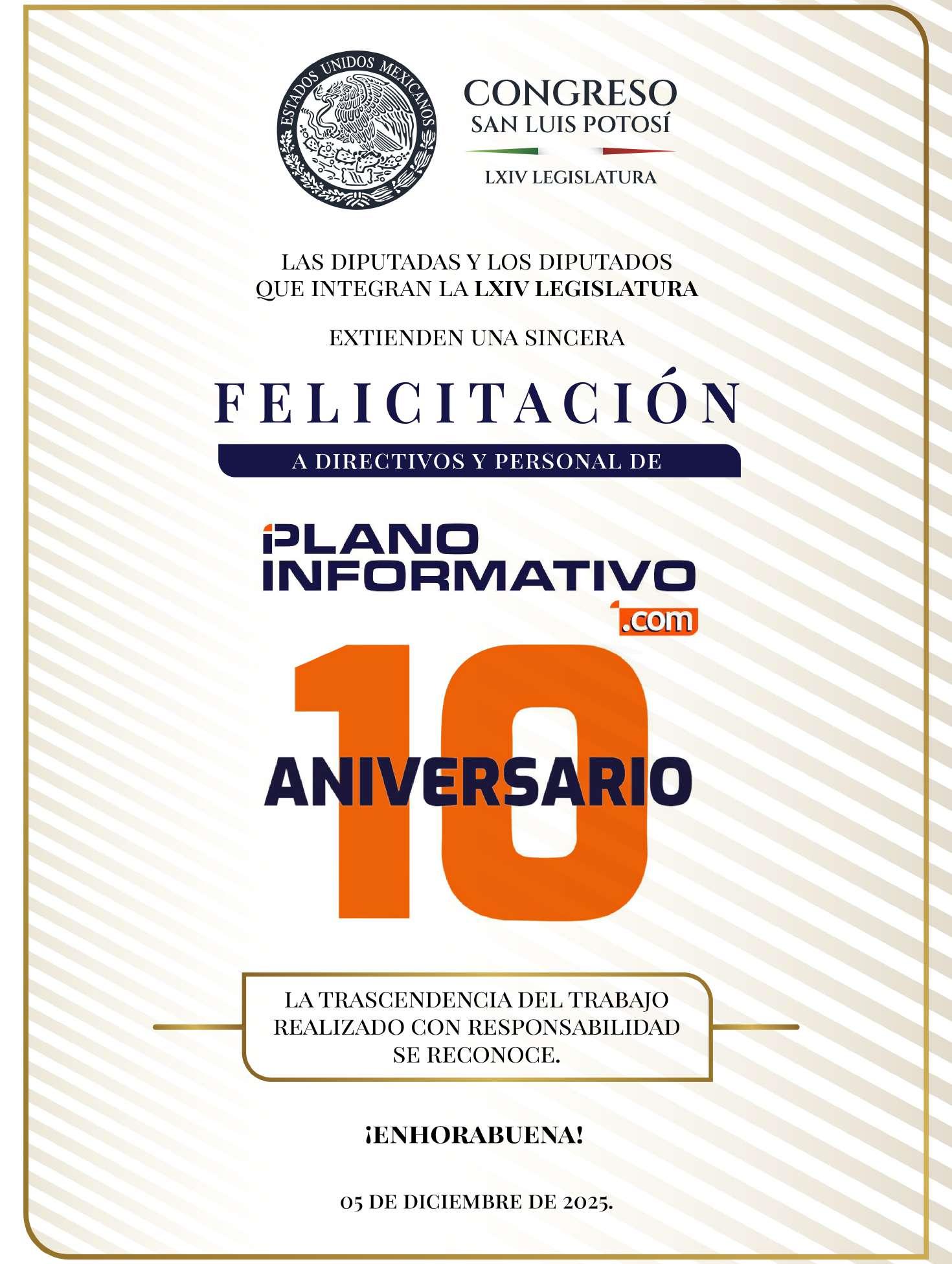 Plano Informativo - Diario Net SA de CV. Publicación diaria. Editor responsable: Francisco Javier Rosales Hernández. Número de Certificado de Reserva de Derechos al Uso Exclusivo otorgado por el Instituto Nacional de Derechos de Autor No. 04-2022-041312533700-101. Número de Certificado de Licitud de Título y Contenido: 16645. Impreso por: CIA. Periodistica del Sol de San Luis Potosi, en Universidad 565, colonia Centro, San Luis Potosí, SLP.CP 78000. Distribuidor de la publicación: Grupo Plano Informativo. Domicilio: Julián Carrillo No. 120-A, Colonia del Valle, San Luis Potosí, SLP. CP. 78200. Domicilio de la publicidad: Julián Carrillo No. 120-A, Colonia del Valle, San Luis Potosí, SLP. CP. 78200. Las opiniones expresadas en este documento son de exclusiva responsabilidad del autor y no representan la opinión de Plano Informativo.