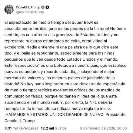A través de su plataforma Truth Social, el mandatario republicano aseguró que la actuación del artista puertorriqueño ha sido “una de las peores de la historia” del Super Bowl y reiteró que, entre otras razones, por la participación del cantante había decidido no asistir al partido entre los New England