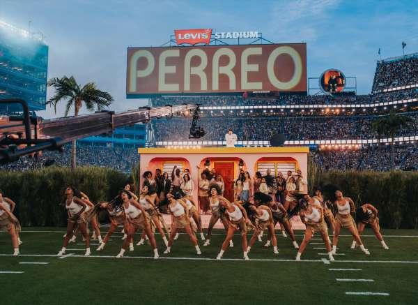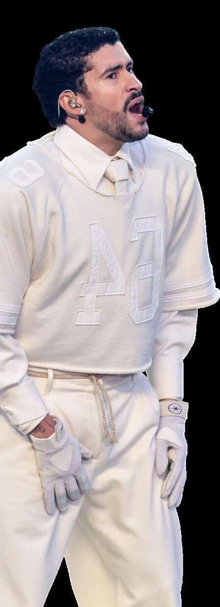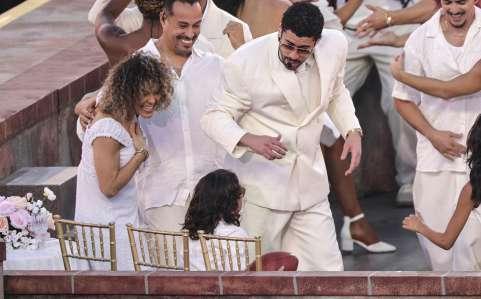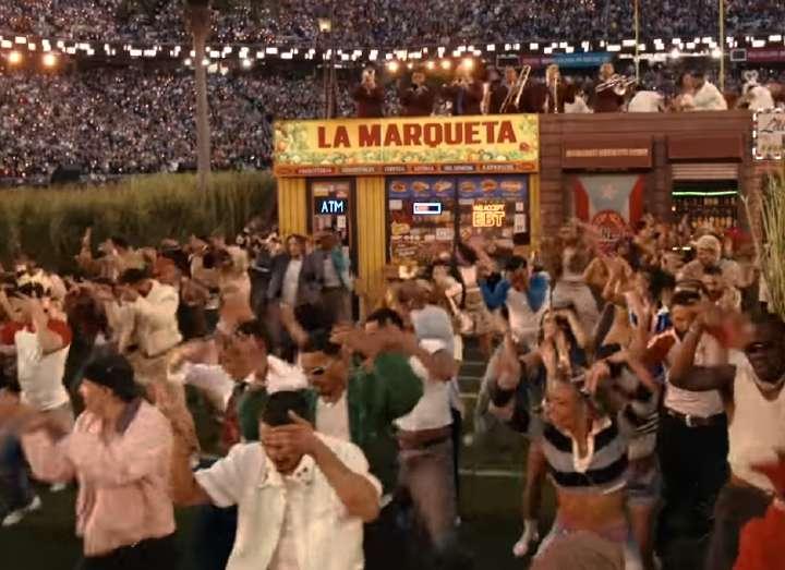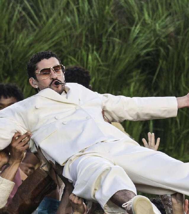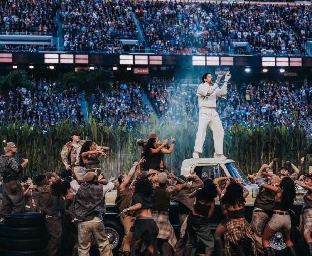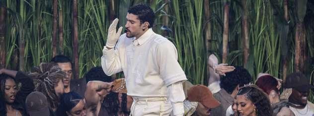 Su presentación destacó por una escenografía inspirada en Puerto Rico, una boda real en escena y un look blanco diseñado por Zara, acompañado de un reloj Audemars Piguet, consolidando un espectáculo cargado de identidad latina y récords de audiencia.