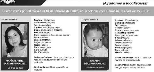 La Fiscalía General del Estado mantiene activa la búsqueda de María Isabel Díaz Hernández, de 28 años, y de su hijo Jovanni Díaz Hernández, de cinco meses, vistos por última vez el 16 de febrero de 2026 en la colonia Vista Hermosa, en Ciudad Valles. Se emitió ficha de localización y se iniciaron diligencias para dar con su paradero.