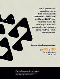 El Inguat lanzó la convocatoria “Guatemala Diseña con las Manos 2026”, dirigida a artesanos y creadores que trabajen técnicas tradicionales o de fusión. Las piezas seleccionadas formarán parte de una exposición itinerante por Europa en 2026, sin costo para sus autores, y luego integrarán una muestra nacional. Un jurado nacional e internacional evaluará la calidad, autenticidad e innovación de las propuestas. La recepción será del 1 al 30 de noviembre de 2025 y los resultados se publicarán en enero de 2026.