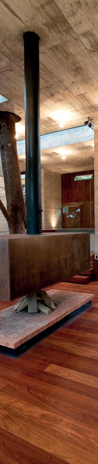 la madera de las formaletas, utiliza materiales reciclados, asegurando continuidad visual cuando la puerta est á cerrada. En los espacios exteriores e interiores aparecen varios firepits ubicados estratégicamente: uno en la sala y área de chimenea, otro cercano al jacuzzi y uno más hacia el comedor.