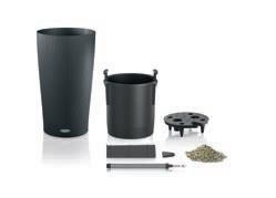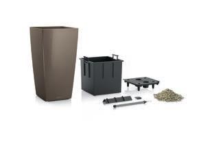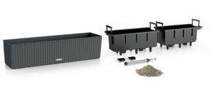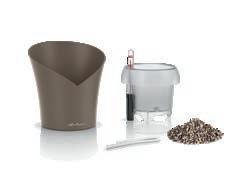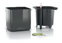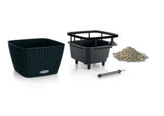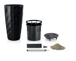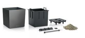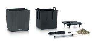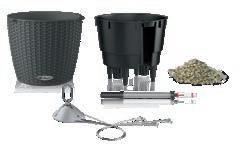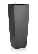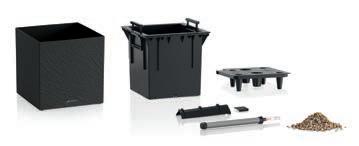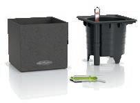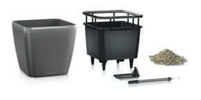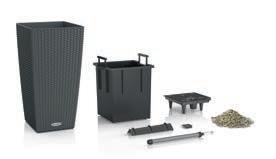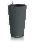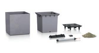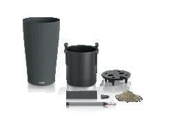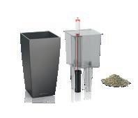The classic self watering system is used for larger LECHUZA planters. It comprises the planter, a planter liner or separator and the components of the irrigation set: the supply shaft, water level indicator and LECHUZA-PON as an irrigation hose layer. A drain plug prevents waterlogging when used outdoors.