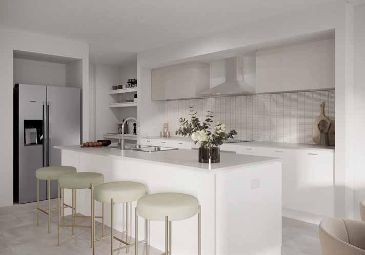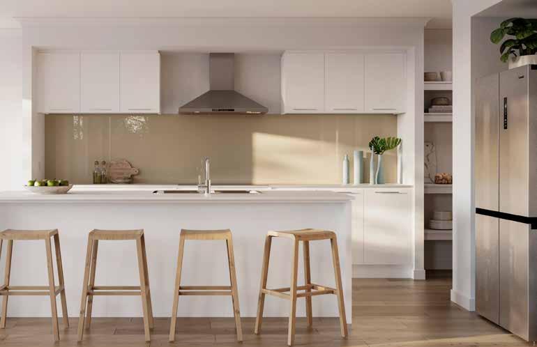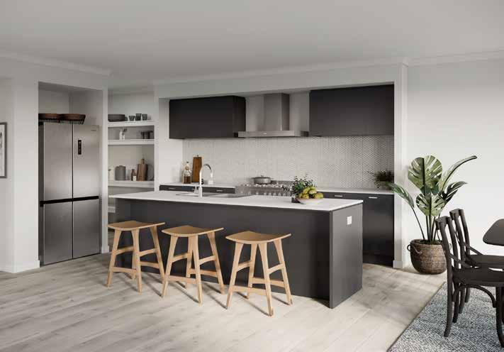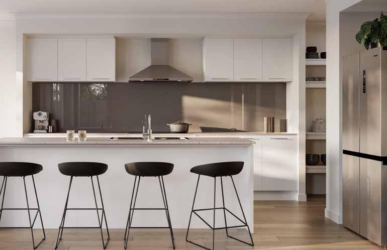 1. Paint – Walls: Alpine Snow | Woodwork & Ceiling: Brilliant White | 2. Kitchen Benchtop – Crystal 3. Kitchen Island – Oyster Grey - Natural Finish | 4. Kitchen Rear Run Base Cabinetry/Laundry Base – Black - Nuance Kitchen Overhead Cabinetry – Colortech satin shaker frame door with clear glass - Colour: Black **Carcass to be Formica - Deep Anthracite
