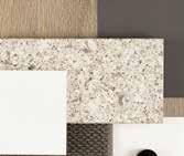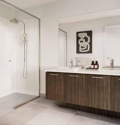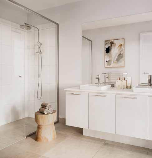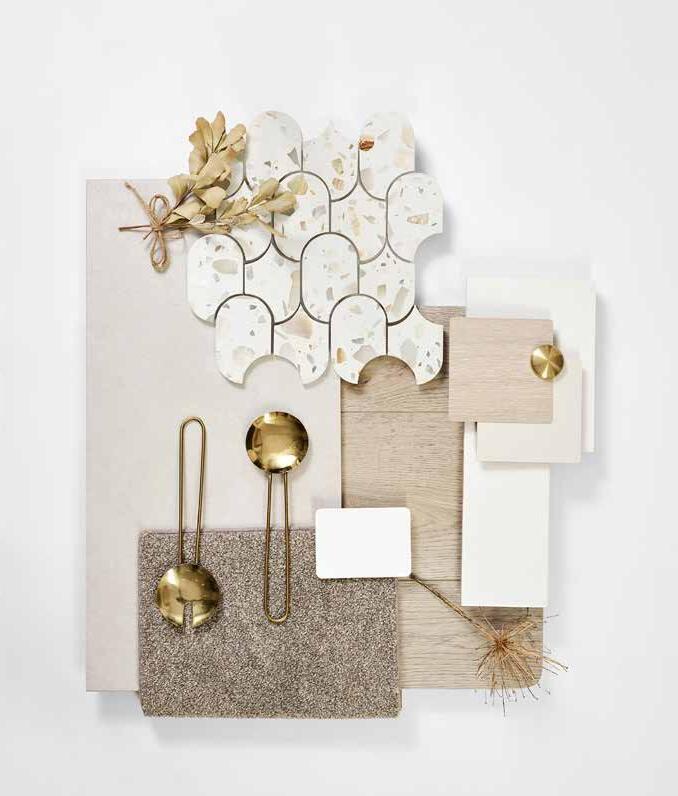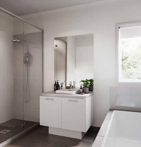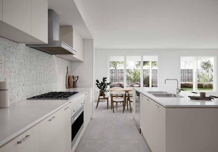 3. Kitchen Base Cabinetry – Sarsen Grey - Silk Finish | 4. Kitchen Overhead Cabinetry – Sarsen Grey - Silk Finish 5. Kitchen Tiled Splashback – Décor 8 Sonic Nougart Terrazzo Mosaic | 6. Bathroom Benchtop – White Truffle 7. Bathroom Cabinetry – Whitewashed Oak - Natural Finish | 8. Bathroom Tile – 300x600 Sicily Stone White Matt – Grout 241 Misty Grey 9. Bathroom Floor Tile – 300x600 Sicily Stone White Matt – Grout 241 Misty Grey