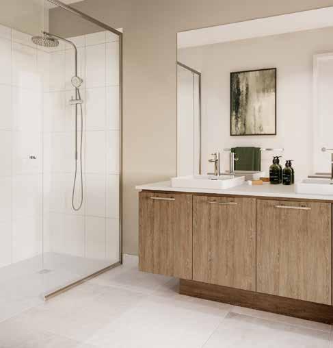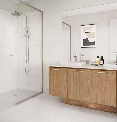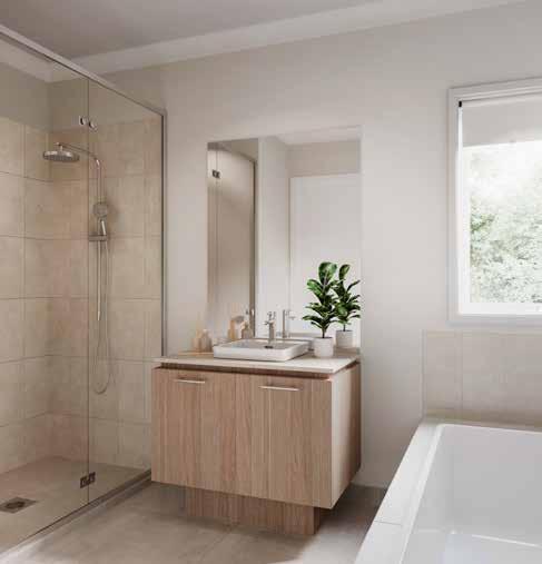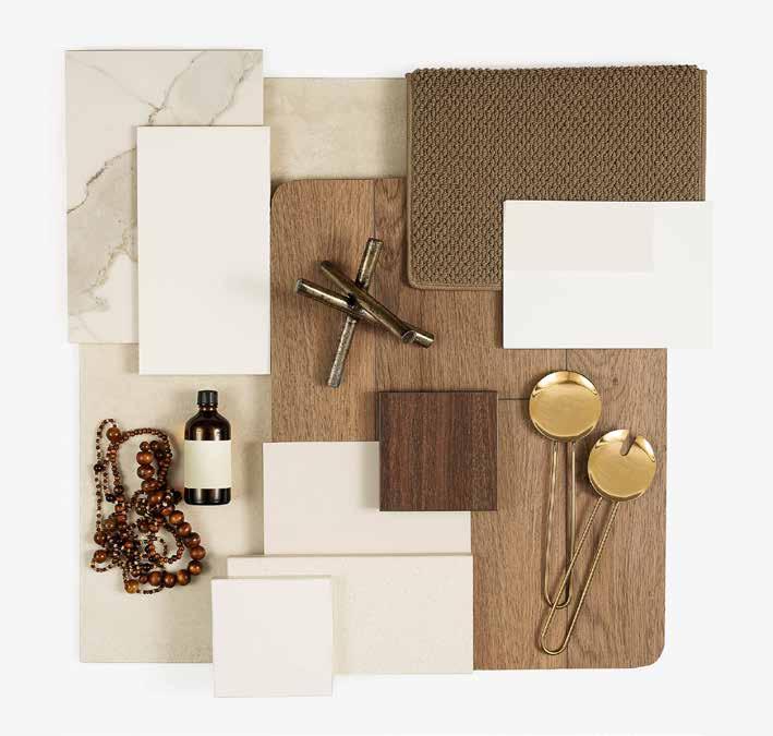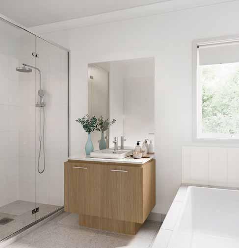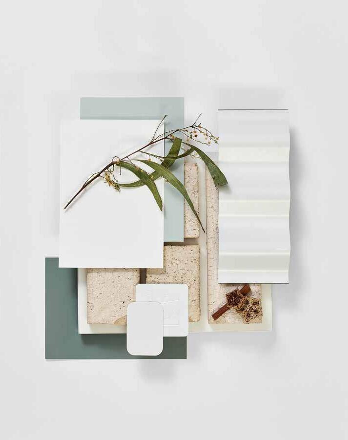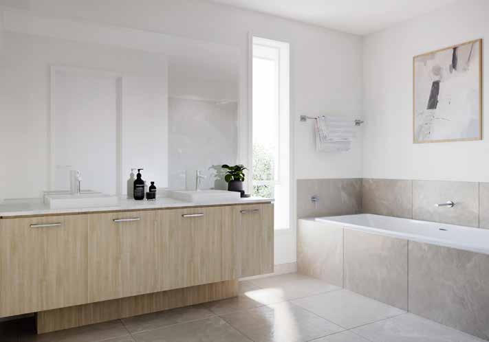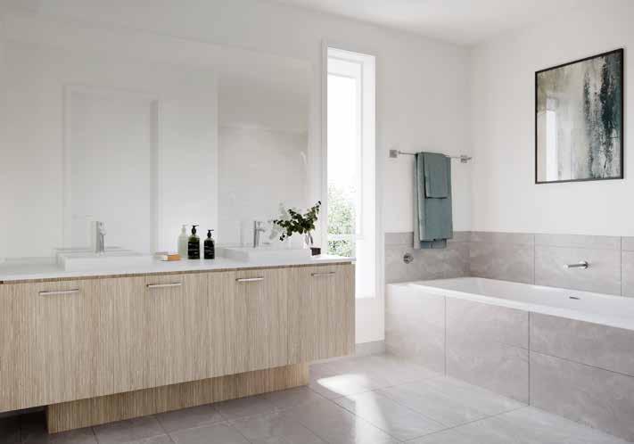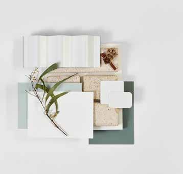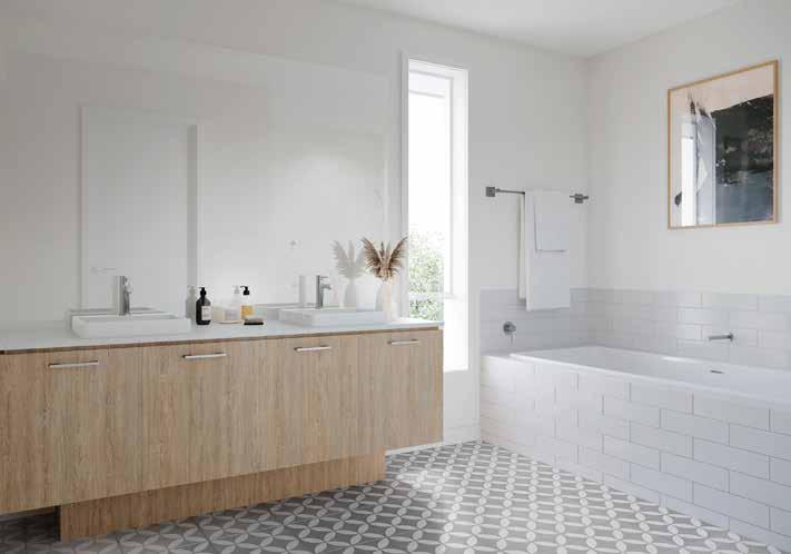 7. Bathroom Cabinetry – Jarrah Legno Natural | 8. Bathroom Wall Tile – Unit White Satin 250x400 | 9. Bathroom Floor Tile – Belga Ivory 600x600 10. Main Floor Tile – Belga Ivory 600x600 | 11. Timber Laminate – Mangrove | 12. Carpet – Wairoa River