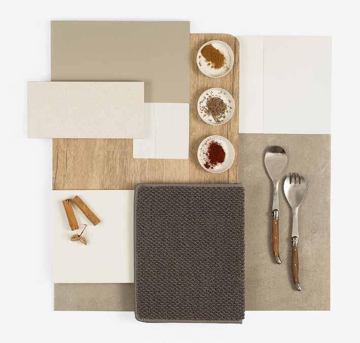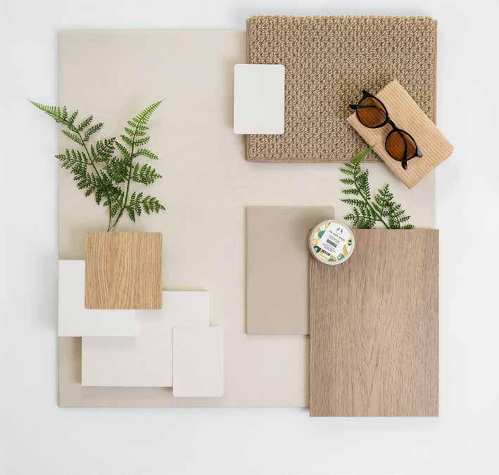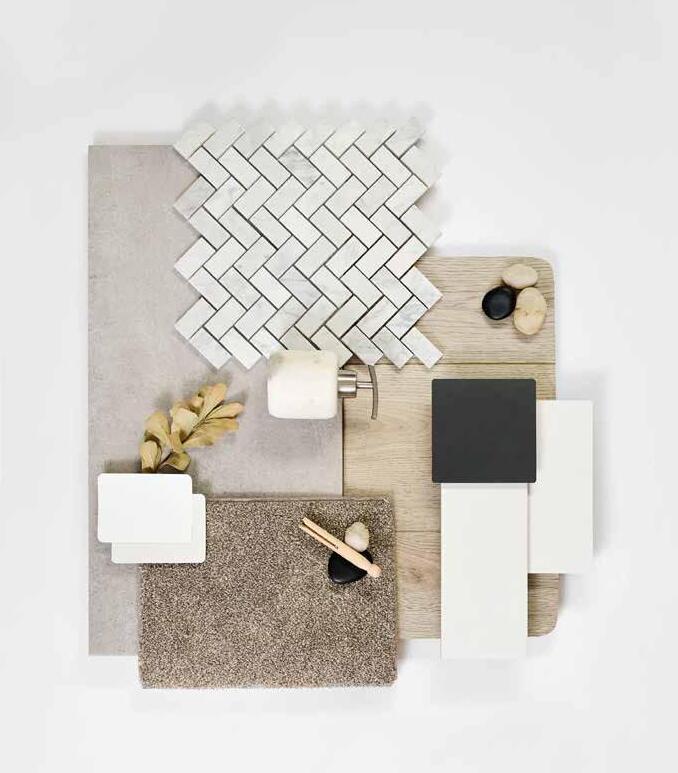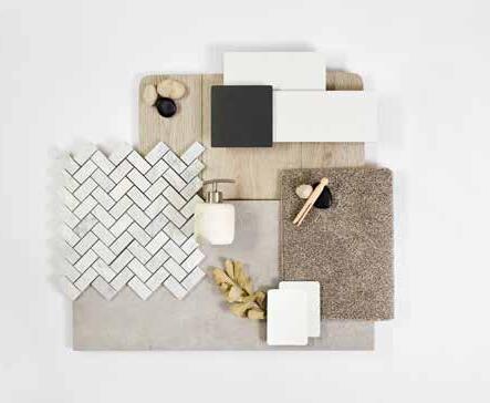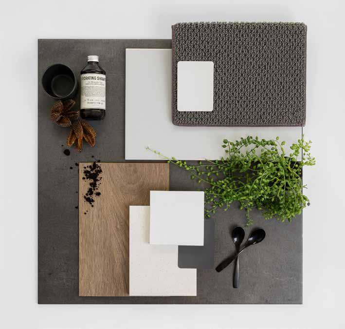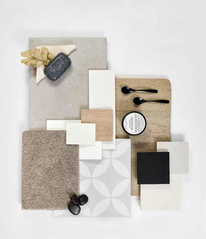7. Bathroom Cabinetry – Classic Oak Natural | 8. Bathroom Wall Tile – Infinite Greige 200x400 | 9. Bathroom Floor Tile – Belga White 600x600 10. Main Floor Tile – Belga White 600x600 | 11. Timber Laminate – Tidal Brown | 12. Carpet – Wairoa River