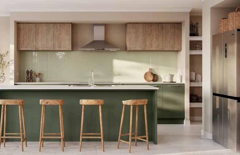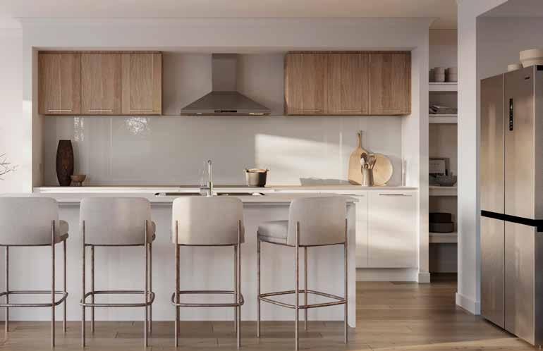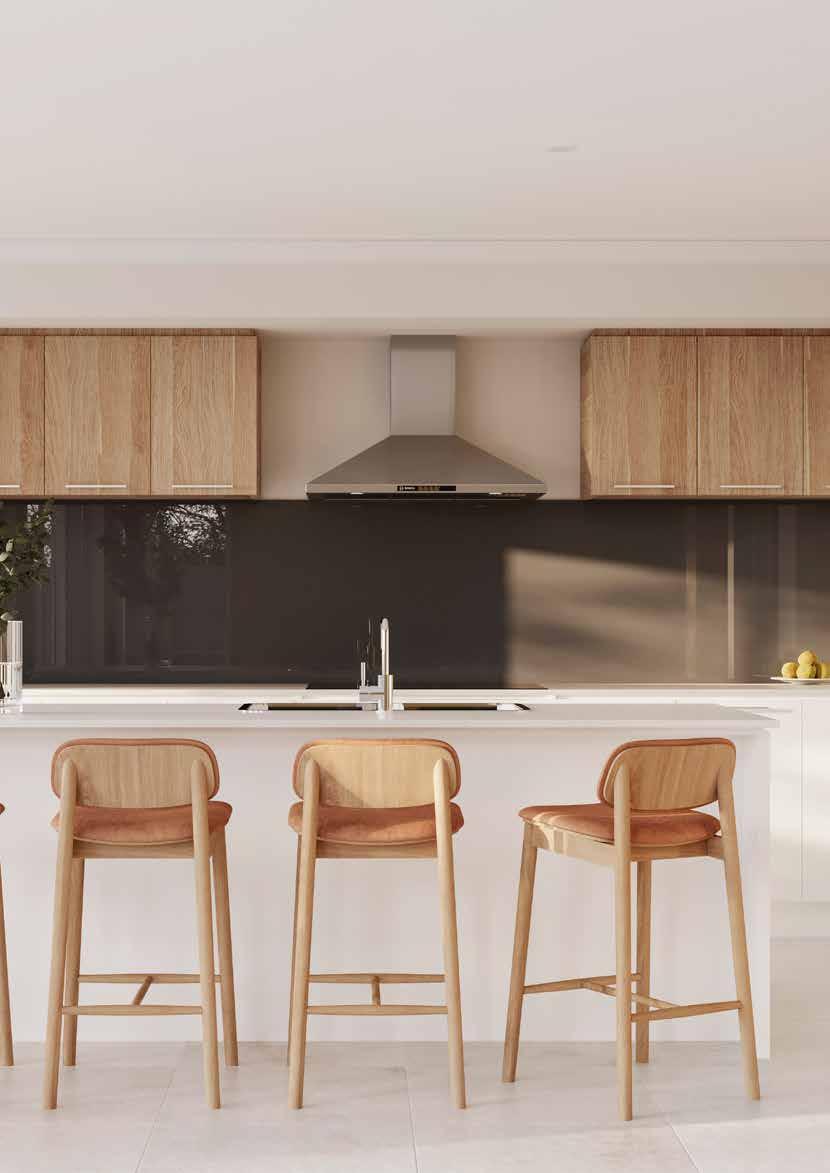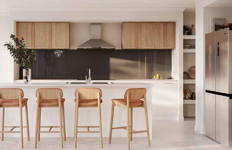 Kitchen Overhead Cabinetry – Rural Oak Natural | 5. Kitchen Glass Splashback – Wistful Willo | 6. Bathroom Benchtop – Sugar Rush 7. Bathroom Cabinetry – Rural Oak Natural | 8. Bathroom Wall Tile – Unite Antique White Gloss 200x400