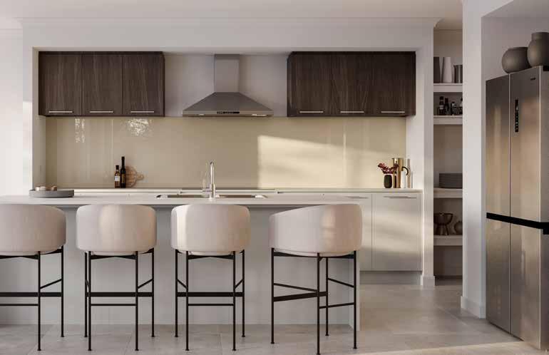 Kitchen Overhead Cabinetry – Blackened Legno Natural | 5. Kitchen Glass Splashback – Frontier | 6. Bathroom Benchtop – White Burst