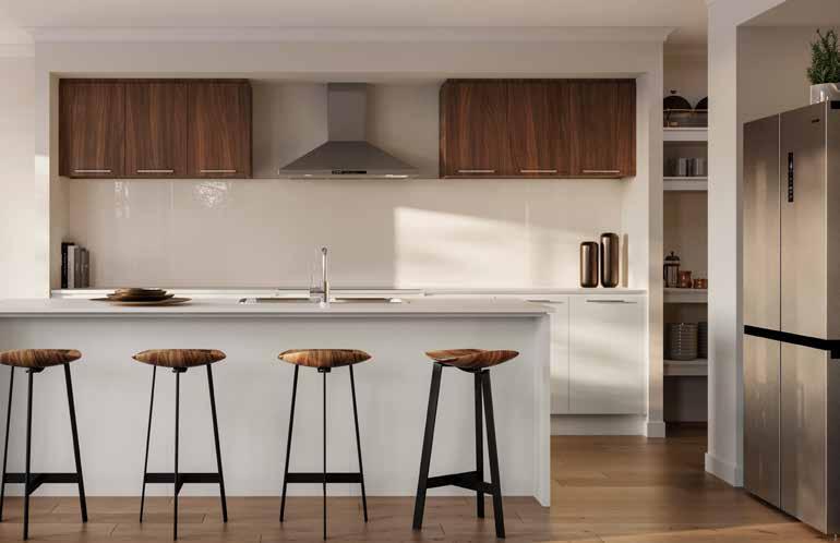 4. Kitchen Overhead Cabinetry – Natural Walnut | 5. Kitchen Glass Splashback – Frontier | 6. Bathroom Benchtop – Sugar Rush 7. Bathroom Cabinetry – Natural Walnut | 8. Bathroom Wall Tile – Unit White Gloss 250x400