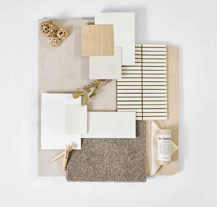 10. Main Floor Tile – 300x600 Sicily Stone White Matt – Grout 241 Misty Grey | 11. Timber Laminate – Wood Effects - Coast Stone 12. Carpet – Beach Isle - Bermuda | 13. Laundry Splashback – 100x300 United Satin White - Grout: 200 White