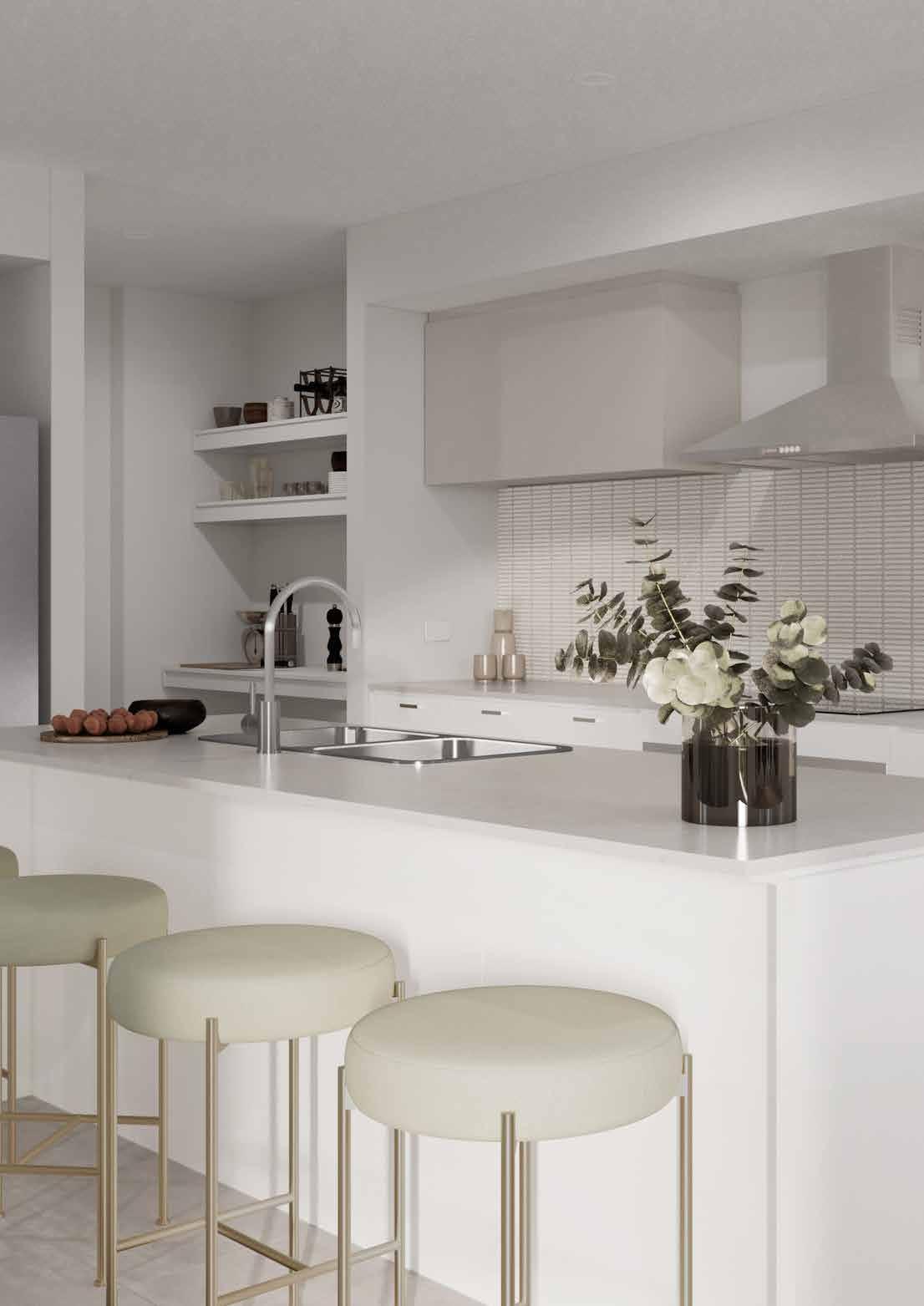 1. Paint Walls – Struan Grey | 2. Kitchen Benchtop – White Burst | 3. Kitchen Base Cabinetry – Ghostgum Silk