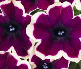Le petunie con fiore a bordo bianco sono tra quelle favorite per colore e qualità di pianta, sempre piuttosto compatta. Per il 2024 offriremo le Compatte picotee a miscuglio e anche a colori separati. Pagina 47