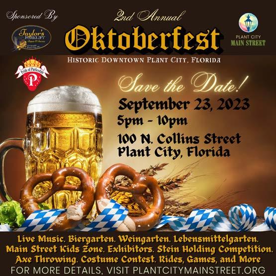 5 to 10 p.m. at 100 N Collins St. Head to Downtown Plant City for Plant City Main Street’s second annual Oktoberfest, an exciting evening filled with lie music, traditional Biergarten and Weingarten experiences, delicious food and more. The family-friendly event will not only feature live music and both a Biergarten and Weingarten, but a variety of German delicacies, a Main Street Kid Zone, exhibitors, a stein-holding competition, axe throwing, a costume contest, rides, games and more. If your business or organization would like to align with this new Plant City tradition, sponsorship availabilities remain available. For more information, visit www.plantcitymainstreet.org/events.