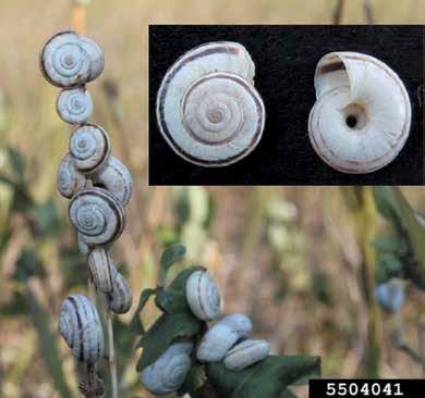 A small land-dwelling snail that feeds on a wide range of crops and will climb vegetation and fenceposts to escape high ground temperatures. They can contaminate hay and crops, clog harvest equipment, and transmit plant and animal diseases. While most agricultural and plant pests are insects or pathogens/diseases, this mollusk pest highlights the need for additional taxa to be considered for national plant pest priorities. This snail has been found in Cascade County, Judith Basin County, and Fergus County.
