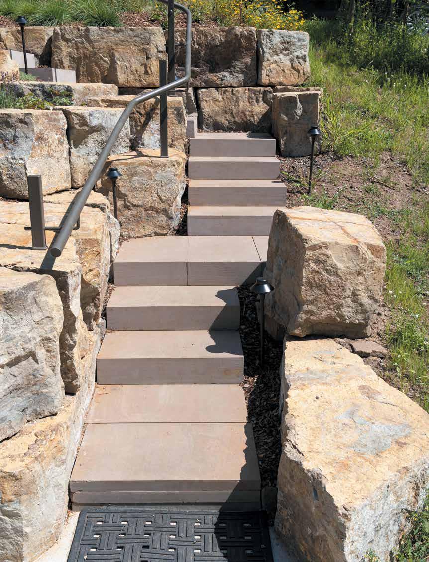 Materials were locally sourced for the frontier sandstone slab treads, moss rock granite accent boulders, and stillwater boulder retaining walls. Black basalt rock mulch contrasts the light tones of the house siding and hardscape materials.