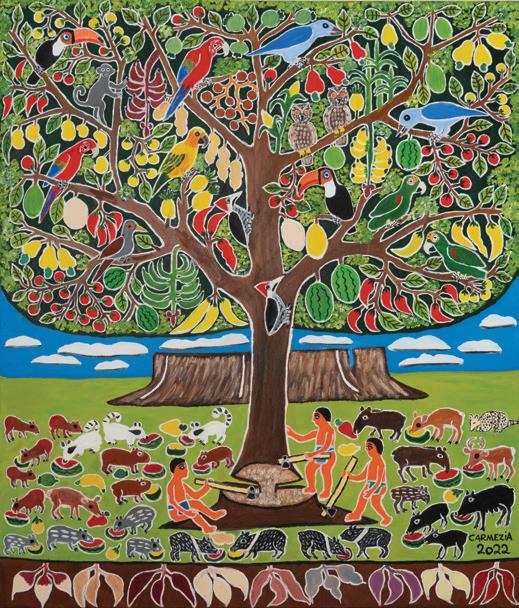 intrincados dos costumes de um povo que foram eternizados nas telas. Já a produção do Mahku é uma explosão de cores que mescla visões fantásticas das lendas e ritos dos Huni Kuin. Nos dois casos, no entanto, as cores vibrantes e a aparente simplicidade da representação humana produzem um choque cultural que deixa clara a distância desses artistas do cânone ocidental – e o quanto isso é importante.