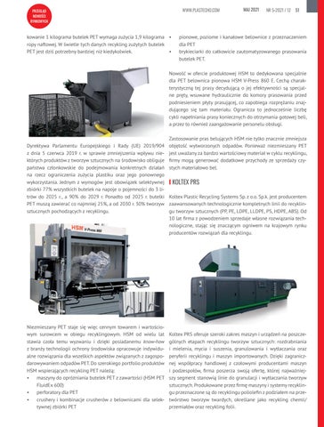 Dyrektywa Parlamentu Europejskiego i Rady (UE) 2019/904 z dnia 5 czerwca 2019 r. w sprawie zmniejszenia wpływu niektórych produktów z tworzyw sztucznych na środowisko obliguje państwa członkowskie do podejmowania konkretnych działań na rzecz ograniczenia zużycia plastiku oraz jego ponownego wykorzystania. Jednym z wymogów jest obowiązek selektywnej IIKOLTEX PRS zbiórki 77% wszystkich butelek na napoje o pojemności do 3 litrów do 2025 r., a 90% do 2029 r. Ponadto od 2025 r. butelki Koltex Plastic Recycling Systems Sp. z o.o. Sp.k. jest producentem PET muszą zawierać co najmniej 25%, a od 2030 r. 30% tworzyw zaawansowanych technologicznie kompletnych linii do recyklinsztucznych pochodzących z recyklingu. gu tworzyw sztucznych (PP, PE, LDPE, LLDPE, PS, HDPE, ABS). Od 10 lat firma z powodzeniem sprzedaje własne rozwiązania technologiczne, stając się znaczącym ogniwem na krajowym rynku producentów rozwiązań dla recyklingu.