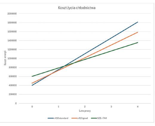 ne. Rozwiązanie przedstawia wykres powyżej. Przecięcie linii jest momentem wyrównania kosztów związanych z konkurencyjnymi technologiami chłodniczymi. Po tym czasie technologia lepsza dla naszego klienta zarabia (uproszczenie). Olbrzymią odpowiedzialnością projektanta – czyli moją – jest poparcie wykresu precyzyjnymi obliczeniami. Obliczenia kosztów eksploatacji należy wykonywać dla lokalizacji zakładu, z uwzględnieniem charakterystyki pracy i wyraźnym wskazaniem ryzyka/niepewności. Dopiero taki materiał może służyć jako poważny dokument.