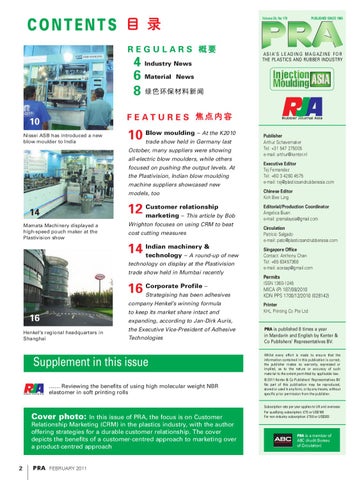 Publisher Arthur Schavemaker Tel: +31 547 275005 e-mail: arthur@kenter.nl Executive Editor Tej Fernandez Tel: +60 3 4260 4575 e-mail: tej@plasticsandrubberasia.com Chinese Editor Koh Bee Ling Editorial/Production Coordinator Angelica Buan e-mail: pramalaysia@gmail.com Circulation Patricio Salgado e-mail: pato@plasticsandrubberasia.com Singapore Office Contact: Anthony Chan Tel: +65 63457368 e-mail: acesap@gmail.com