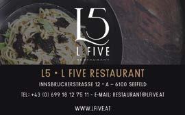 Highlights. Das L5 ist eine gemütliche, schicke Umgebung zum Entspannen, Unterhalten und Feiern und empfiehlt sich auch für Familienfeste und Erstkommunionfeiern. Es befindet sich am östlichen Eingang der Fußgängerzone und wird im Frühjahr auch wieder seinen wunderschönen Gastgarten unter den Kastanienbäumen öffnen.