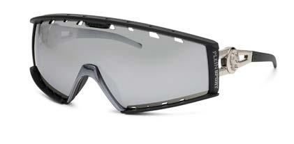 ALLURE FUTURISTA PER QUESTA MASCHERA NATA SOTTO L’EGIDA DEL LESSI IS MORE. UNICO ‘VEZZO’ I DECORI AI LATI DELLA LENTE A FORMA DI BULLONE E IL LOGO PROPOSTO SULL’ASTA.