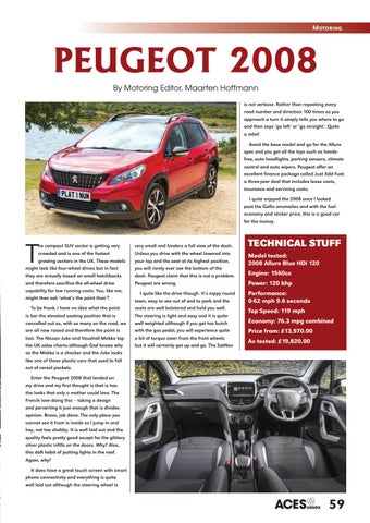 PEUGEOT 2008 By Motoring Editor, Maarten Hoffmann is not verbose. Rather than repeating every road number and direction 100 times as you approach a turn it simply tells you where to go and then says ‘go left’ or ‘go straight’. Quite a relief. Avoid the base model and go for the Allure spec and you get all the toys such as handsfree, auto headlights, parking sensors, climate control and auto wipers. Peugeot offer an excellent finance package called Just Add Fuel; a three-year deal that includes lease costs, insurance and servicing costs. I quite enjoyed the 2008 once l looked past the Gallic anomalies and with the fuel economy and sticker price, this is a good car for the money.