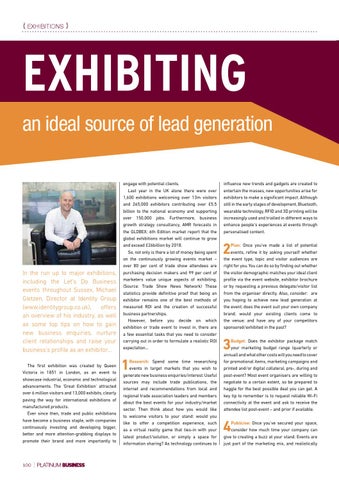 engage with potential clients. Last year in the UK alone there were over 1,600 exhibitions welcoming over 13m visitors and 265,000 exhibitors contributing over £5.5 billion to the national economy and supporting over 150,000 jobs. Furthermore, business growth strategy consultancy, AMR forecasts in the GLOBEX: 6th Edition market report that the global exhibitions market will continue to grow and exceed £26billion by 2018. So, not only is there a lot of money being spent on the continuously growing events market – over 80 per cent of trade show attendees are purchasing decision makers and 99 per cent of marketers value unique aspects of exhibiting. (Source: Trade Show News Network) These statistics provide definitive proof that being an exhibitor remains one of the best methods of measured ROI and the creation of successful business partnerships. However, before you decide on which exhibition or trade event to invest in, there are a few essential tasks that you need to consider carrying out in order to formulate a realistic ROI expectation…