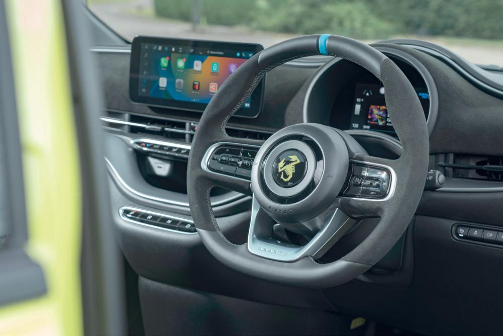 It has three driving modes – Turismo (comfort), Scorpion Street (sport performance) and Scorpion Track (Sport performance without one pedal drive). It will take you from 0-62 mph in seven seconds, which is 0.3 seconds faster than the Abarth 595. Indeed, all of Fiat’s acceleration data for the Abarth 500e show that it appears to be stealing a significant march on its elder petrol siblings quite considerably.