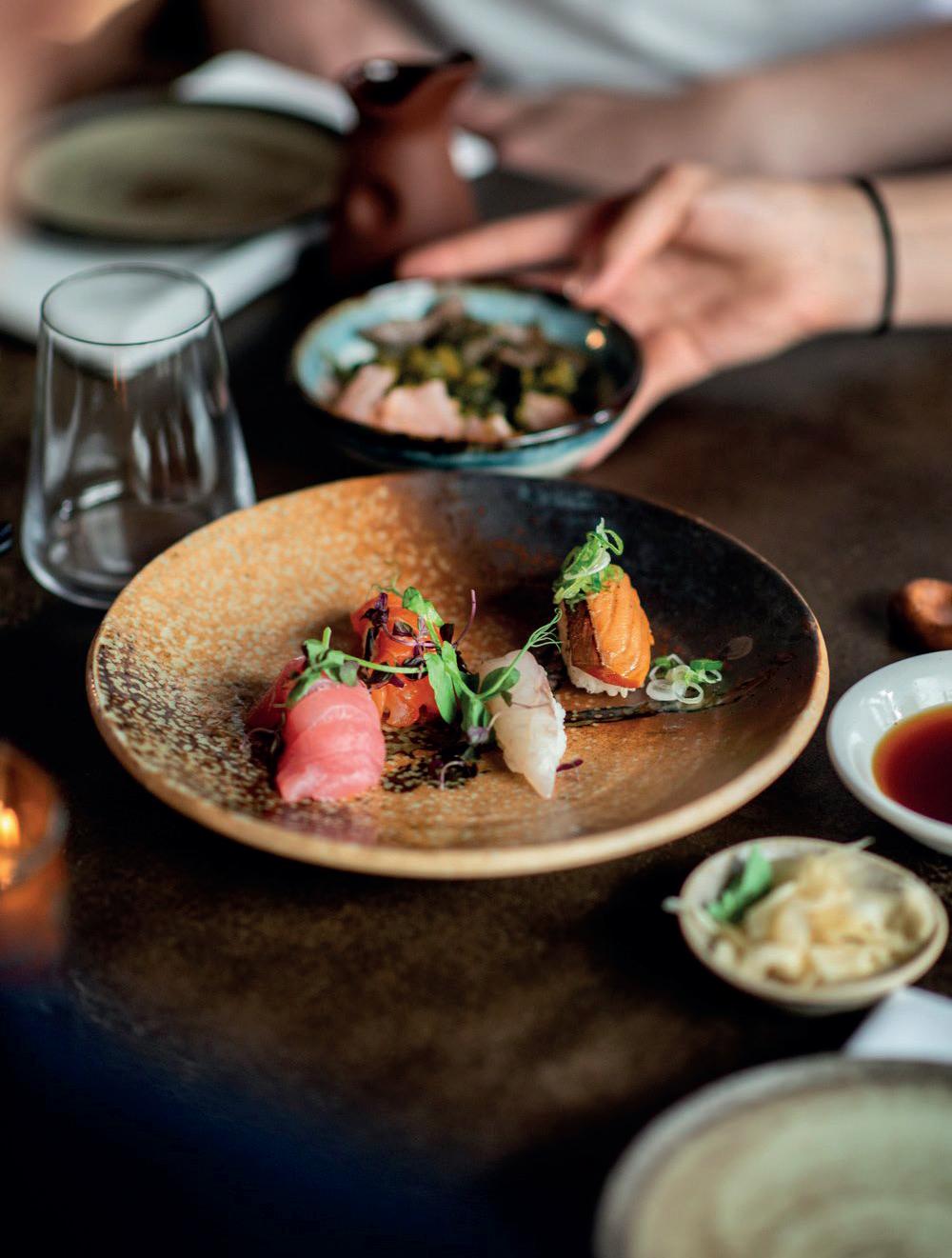 Fumi focuses on the seasons. All produce is sourced locally with nothing mass produced - farm to table. Th is extends to the substantial wine list where you’ll fi nd mostly small, often organic wineries. For dinner, you can choose between the traditional menu or the Omakase menu, directly translated to ‘I’ll leave it up to you’ where the chef makes all your dining decisions – you sit back while being served four or six courses, paired with the perfect wine or cocktails. The chef will take care of your dietary requirements too.