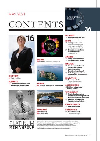 All rights reserved. The views expressed in this publication are not necessarily those of the publisher. The publisher cannot accept responsibility for any errors or omissions relating to advertising or editorial. The publisher reserves the right to change or amend any competitions or prizes offered. No part of this publication may be reproduced without prior written consent from the publisher. No responsibility is taken for unsolicited materials or the return of these materials whilst in transit. Platinum Business Magazine is owned and published by Platinum Media Group.