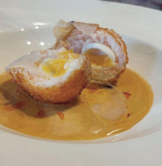 We couldn’t resist trying the honey-glazed chicken nugget with buffalo sauce. This was worlds apart from anything you’d find in a takeaway box: golden, crisp, sticky, and spicy in just the right measure. The prawn scotch egg was another favourite, delicately balanced and light, with the prawn filling keeping everything fresh and clean rather than heavy.