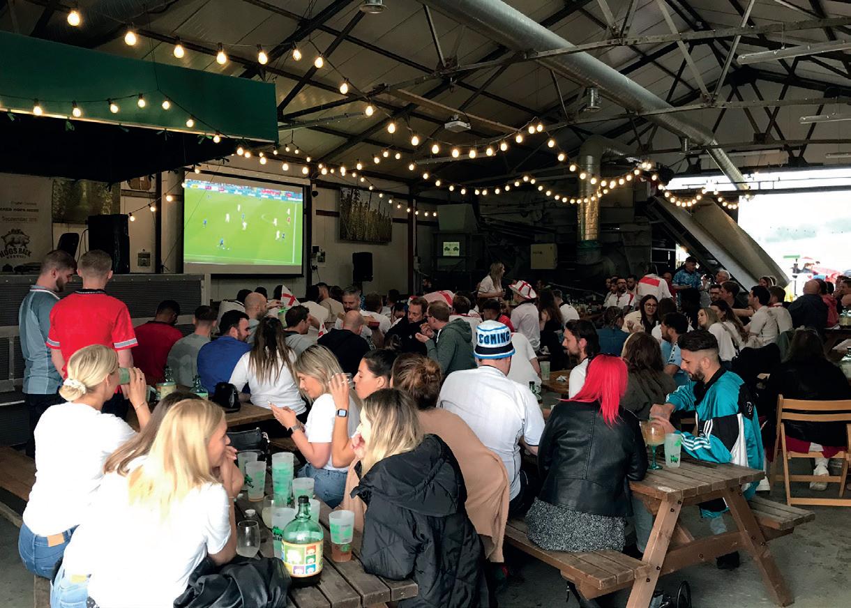 Housed in a restored hop kiln, the Brewery Tap boasts a bar crafted from aged whiskey barrels, beer fresh from the cellar, comfy sofas, a wood burner, up-cycled tables made from old brewery casks and historic images of Surrey’s hop growing heritage. Post Covid, the Hop Hall has come into its own. With high ceilings and huge barn doors, it provided a perfect well-ventilated indoor area to complement the beer garden, with views over the hop garden and beautiful Surrey countryside.