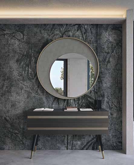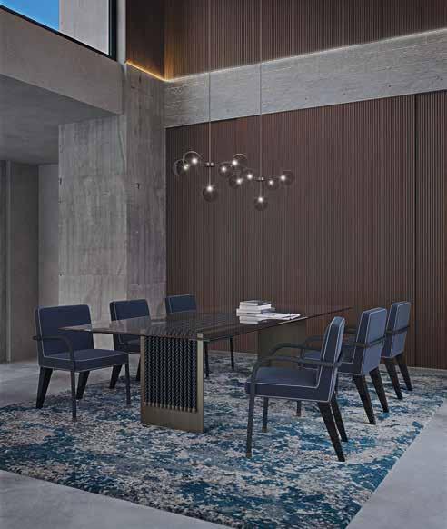 It is on the shores of Lake Maggiore, but it could be anywhere. We chose this house nestled in limestone rock and overlooking the Borromean Islands as a source of inspiration for a sober and elegant style, transcending its location. It is the residence of a wellknown novelist: an oasis of tranquillity and design with an eclectic flavour and large windows that bring the beauty of nature inside. The spaces have a fluid and harmonious feel, and so do the furnishings. The Clapton and Highlander sofas are the stars of the living room. The former features a wide, comfortable seat and the geometric volumes are highlighted by external metal plates covered in leather and by the piping that enhances the cushions’ shape. The Highlander sofa, with an essential design, stands out for the alternation of different finishes, capitonné components and pleating on the backrest. The dining room showcases the spectacular Glasgow, an imposing rectangular table embellished with decorative ropes and featuring a glass top and a metal frame with a bronzed finish. In the bedroom, the palette of blues and greys adopted for the rest of the house and the use of natural materials contribute to creating a sense of intimacy, while the presence of refined craftsmanship enhances the decorativeness already present in the wallpaper. The Broadway bed, in particular, features elegant capitonné work, an expression of timeless style brought up to date by the rounded lines and angled square feet. The Sean night tables and chest of drawers, in Tay wood with bronze finish details, complete the set. gianfrancoferrehome.it