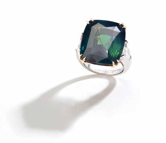 Un anello in oro bianco così raro e significativo, con al centro uno Zaffiro verde naturale ct 9.59, abbracciato sui lati da due diamanti taglio triangolo ct 1.40 D color Collezione Bartorelli